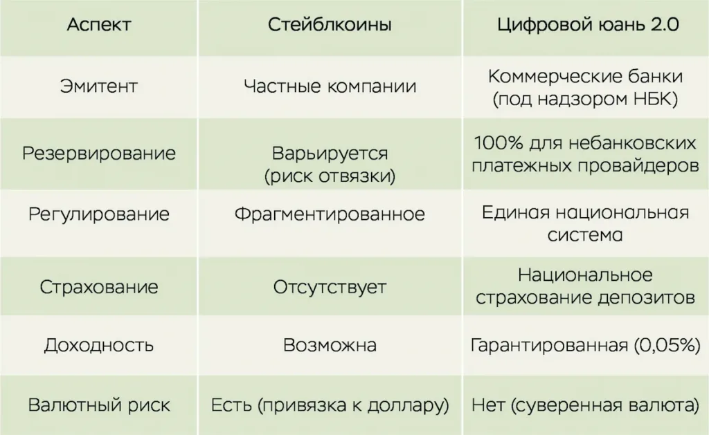 Китайский ответ принципиально иной. Вместо разрешения частных стейблкоинов НБК сделал государственную цифровую валюту процентной, фактически поглотив привлекательные функции стейблкоинов (скорость, программируемость, расчеты в реальном времени) в рамках суверенной и жестко регулируемой структуры.